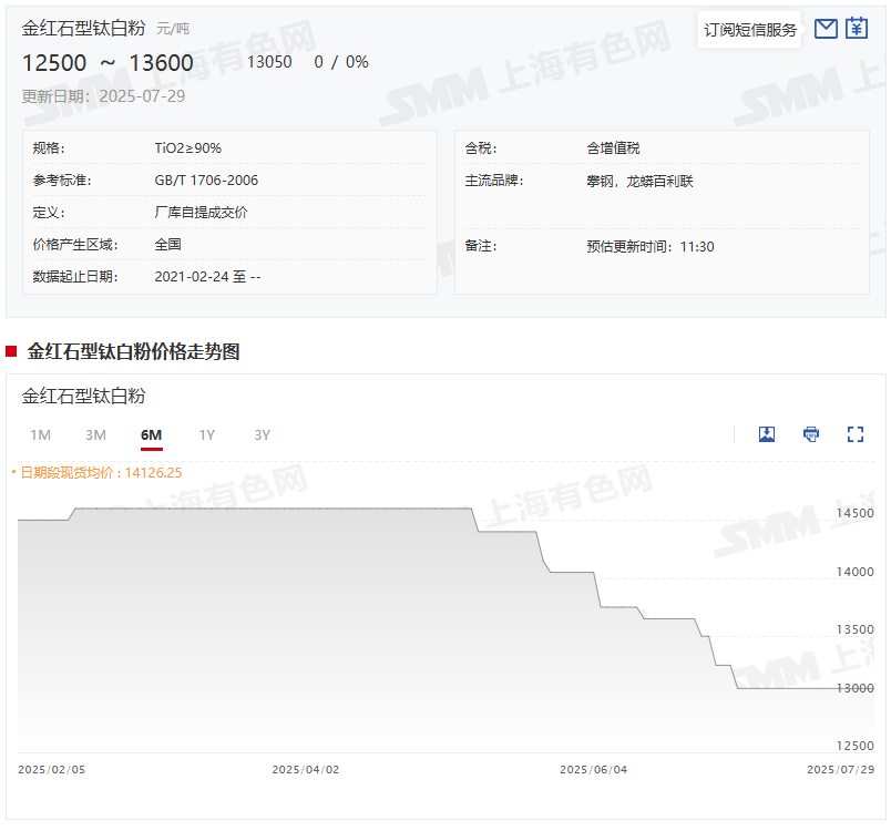 据SMM报价显示,7月29日,SMM金红石型钛白粉报价为12500元/吨-13600元/吨,其均价报13050元/吨,其均价自7月2日跌至13050元/吨的年内低点之后,便一直持平于13050元/吨这一均价,而13050元/吨这一均价与2024年12月31日的均价14500元/吨相比,其均价今年以来下降了1450元/吨,其跌幅为10%。