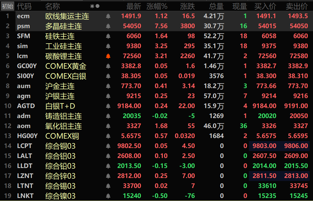 此外,铸造铝主连期货微跌0.02,氧化铝主连涨1.68%。碳酸锂主连涨3.21%,工业硅主连涨3.25%。多晶硅主连涨7.56%。