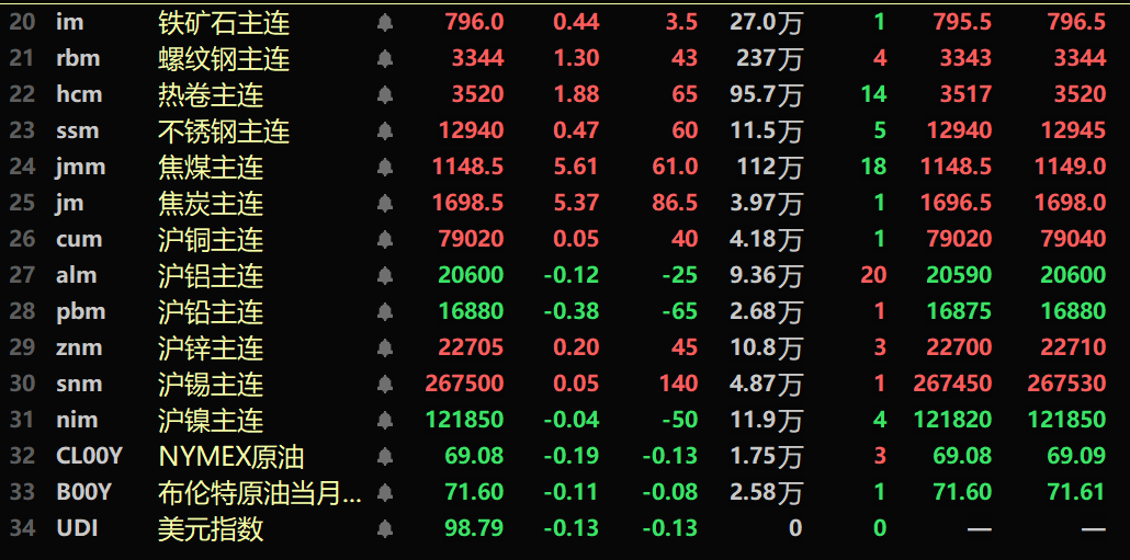 黑色系全线上涨,铁矿涨0.44%,螺纹涨1.3%,热卷涨1.8%。不锈钢涨0.47%。双焦方面:焦煤主力合约涨5.61%,焦炭期货主力合约涨5.37%。