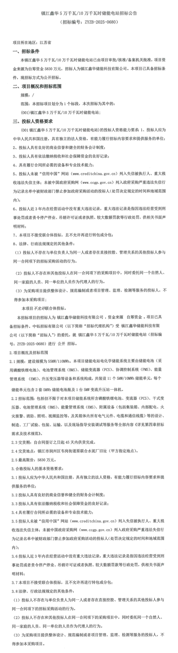 7月29日,镇江鑫华储能科技有限公司发布镇江鑫华5万千瓦/10万千瓦时储能电站招标公告,项目位于江苏镇江,项目建设规模为55MW/110MWh。项目资金来源为自筹资金5830万元,折合单价0.53元/Wh。