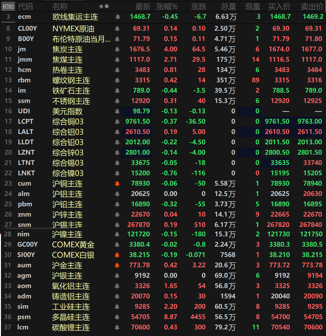 此外,碳酸锂主连涨0.43%,工业硅主连涨2.2%,多晶硅主连大涨8.87%。欧线集运主连以0.45%的跌幅报1468.7。