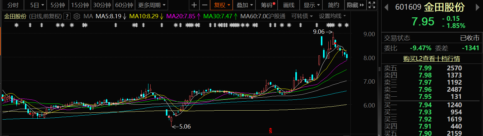 金田股份7月30日股价出现下跌,截止30日收盘,金田股份跌1.85%,报7.95元/股。