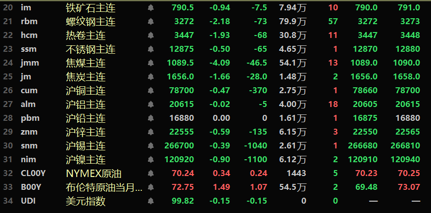 隔夜黑色系均飘绿,铁矿跌0.94%,不锈钢跌0.5%,螺纹钢跌2.18%,热卷跌1.93%。双焦方面:焦煤跌4.09%,焦炭跌1.66%。