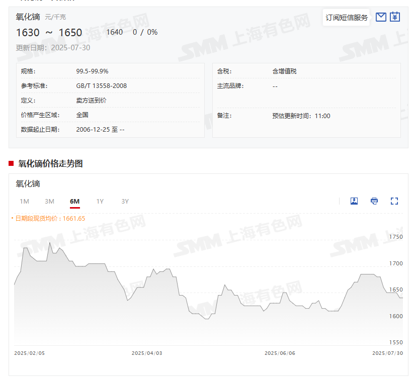 以SMM氧化镝今年上半年的价格为例:氧化镝6月30日的均价为1615元/千克,与其2024年12月31日1610元/千克的均价相比,上涨了0.31%;而对比氧化镝2025年上半年的日均价1660.26元/千克与2024年上半年的日均价1941.97元/千克可以看出,其今年上半年日均价同比下跌了14.51%。
