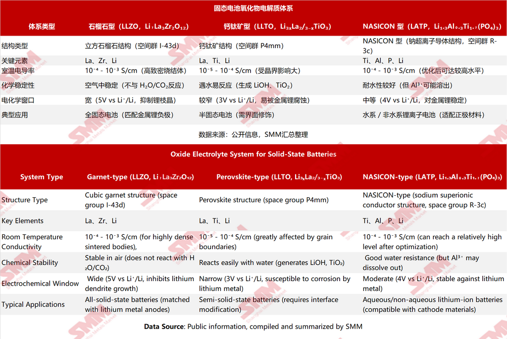 【SMM固态电池科普:氧化物固态电解质材料体系解析与企业布局】解析氧化物电解质体系中石榴石型(LLZO)、钙钛矿型(LLTO)和NASICON型(LATP)三种材料的核心差异与特点。从结构与离子迁移机制、化学稳定性与界面兼容性、制备难点与工艺控制,到应用场景与技术瓶颈,全面剖析了各自的优势与挑战。同时,详细介绍了各企业在氧化物电解质电池领域的布局情况,为读者呈现了当前氧化物固态电池的研究与应用现状,以及未来的发展趋势。