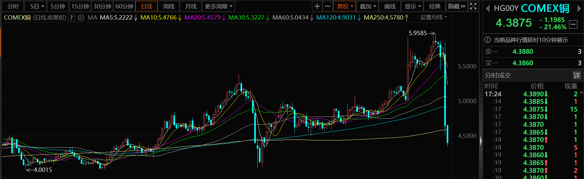 特朗普宣布8月1日起对进口半成品铜等产品征收50%关税,把阴极铜等铜原料排除在外,击落COMEX铜的市场表现,COMEX铜在7月30日以暴跌收盘之后,7月31日继续大幅下挫,截至31日17:35分左右,COMEX铜报4.3890美元/磅,跌21.43%;伦铜报9639.5美元/吨,跌幅为0.61%;沪铜跌1.3%,报78040元/吨;而随着COMEX铜的暴跌,纽伦价差也大幅缩窄至36.58美元/吨。