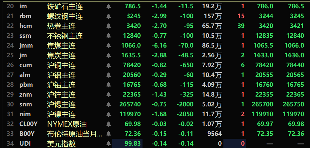黑色系全线下跌,铁矿跌1.44%,螺纹跌2.99%,热卷跌2.7%。不锈钢跌0.77%。双焦方面:焦煤主力合约跌6.16%,焦炭主力合约跌2.88%。