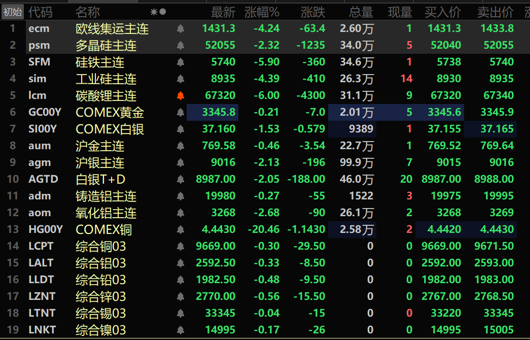 此外,铸造铝主连期货微跌0.27%,氧化铝主连跌2.68%。碳酸锂主连跌6%,工业硅主连跌4.39%。多晶硅主连跌2.32%。