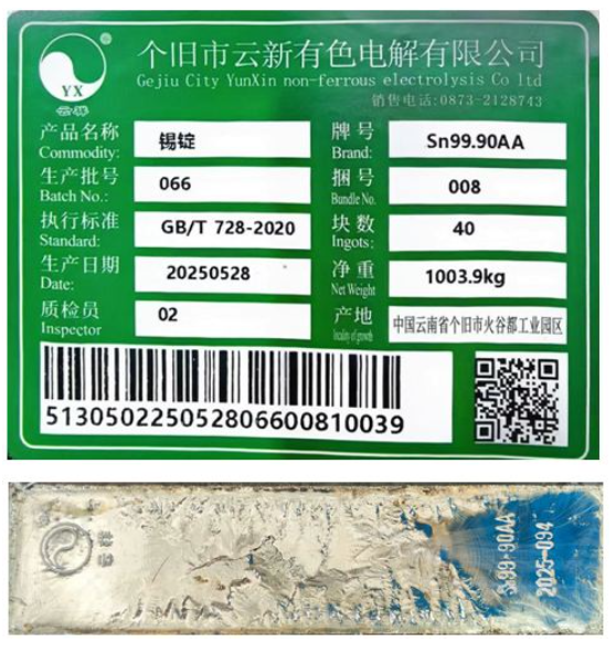7月31日,上海期货交易所发布《关于同意个旧市云新有色电解有限公司“云祥”牌锡锭注册的公告》。公告内容如下: