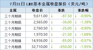 伦敦时间7月31日17:00(北京时间8月1日00:00),LME三个月期铜下跌87.5美元,或0.9%,收报每吨9,611.0美元。