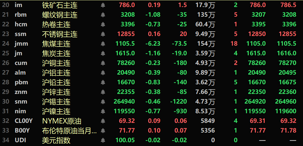 黑色系多飘绿,铁矿涨0.19%,螺纹跌1.08%,热卷跌0.73%。不锈钢涨0.16%。双焦方面:焦煤主力合约跌6.23%,焦炭主力合约跌1.16%。