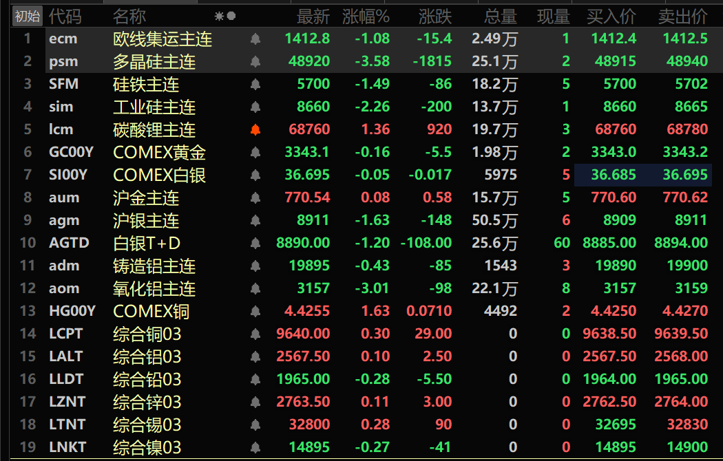 此外,铸造铝主连期货微跌0.43%,氧化铝主连跌3.01%。碳酸锂主连涨1.36%,工业硅主连跌2.26%。多晶硅主连跌3.58%。