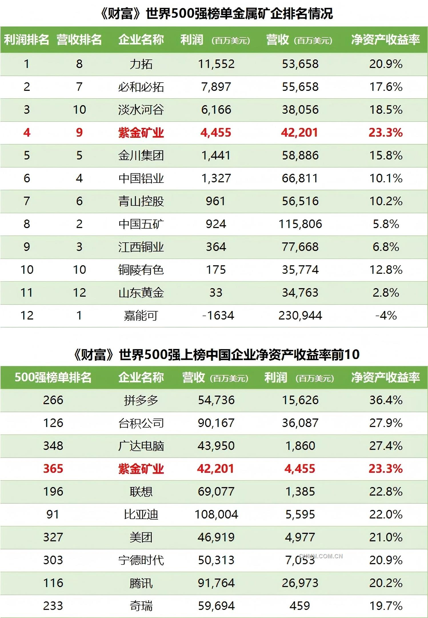 7月29日,2025年《财富》世界500强排行榜发布,榜单以营收为排名依据,紫金矿业连续5年上榜,今年位居第365位。若从盈利指标看,紫金矿业利润居总榜单第209位和全球金属矿企第4位,净资产收益率(ROE)居上榜中国企业第4位、全球金属矿企第1位。