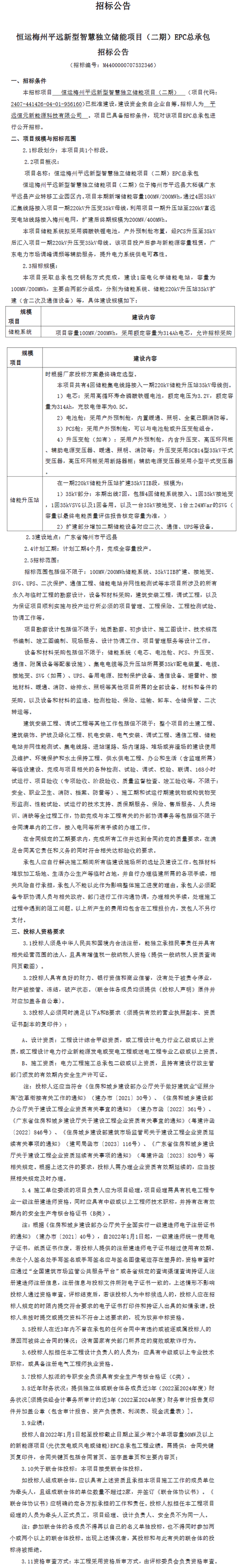 北极星储能网获悉,8月1日,恒运梅州平远100MW200MWh新型智慧独立储能项目EPC招标,招标人为平远恒元新能源科技有限公司。