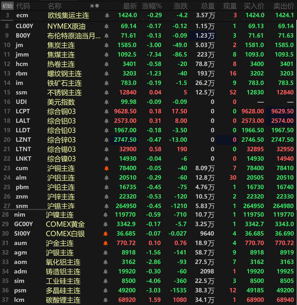 此外,碳酸锂主连涨1.59%,多晶硅主连跌3.03%。工业硅主连跌4.06%。欧线集运主连跌0.29%报1424。