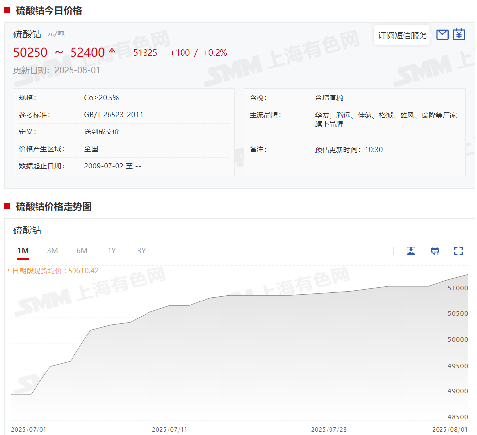 据SMM现货报价显示,本周硫酸钴现货报价涨至50250~52400元/吨,均价报51325元/吨,较7月25日上涨275元/吨,涨幅达0.54%。