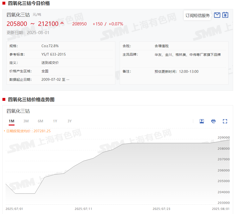据SMM了解,本周四氧化三钴报价持稳于21.0-21.3万元/吨区间,周度成交活跃度环比提升。供应端受原料紧缺制约,上游企业减产停产范围扩大,持货商惜售情绪进一步加剧;需求端受益于终端消费向好,钴酸锂正极厂采购频次增加,行业库存呈现小幅去化。当前实际成交价区间拓宽至20.5-21.5万元/吨。SMM预计后续四氧化三钴价格或维持上行通道,但8月上旬涨幅将边际收窄,整体上行空间有限。