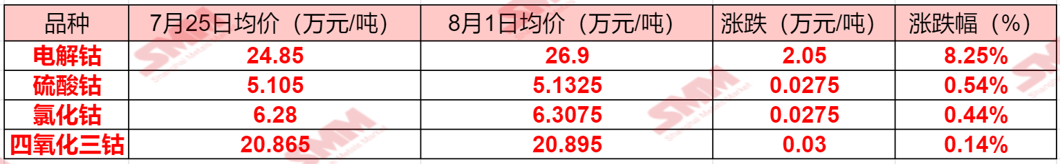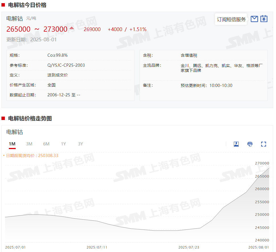 SMM 8月1日讯:本周钴系产品报价集体拉涨,其中电解钴冶炼厂受生产成本持续抬升影响而上调报价,在此影响下,电解钴现货报价单周上涨逾2万元,硫酸钴贸易商更是持看涨情绪,暂缓报价……SMM整理了本周钴系产品的现货报价情况,具体如下:
