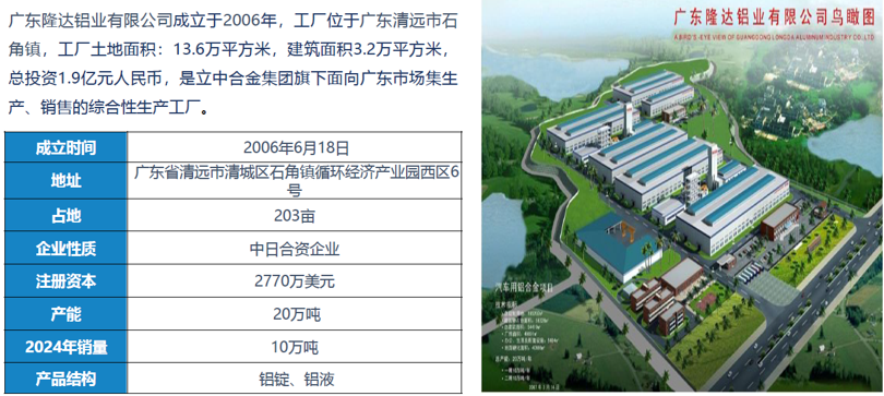 广东隆达铝业有限公司成立于2006年,工厂位于广东清远市石角镇,工厂土地面积:13.6万平方米,建筑面积3.2万平方米,总投资1.9亿元人民币,是立中合金集团旗下面向广东市场集生产、销售的综合性生产工厂。