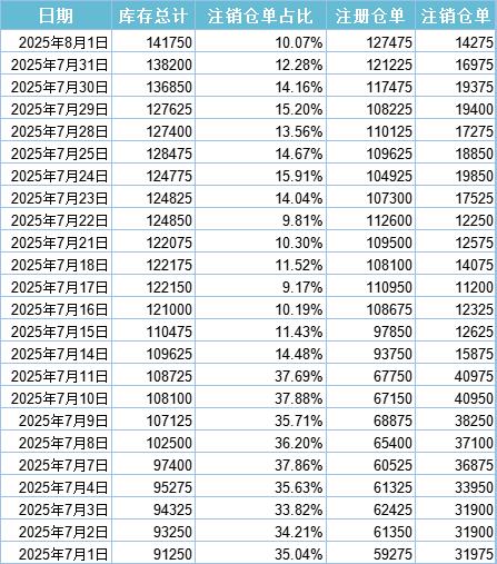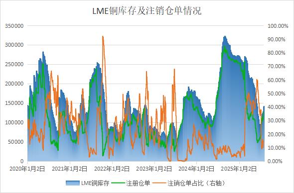 由于美国对铜关税排除了精炼铜,COMEX铜出现暴跌一幕,与LME铜价差急剧收窄,基本在平水附近波动,溢价的崩塌使得全球铜再无动力向美国流入,市场预期后续LME铜库存会继续抬升。最近LME铜库存已经不断累积,注册仓单同步抬升,注销占比持续维持在较低位置。