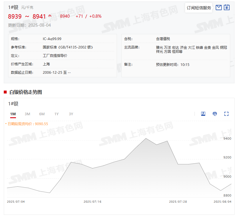 白银现货方面:8月4日,SMM1#白银上午出厂参考均价为8940元/千克,均价较前一交易日上涨71元/千克,涨幅为0.8%。据SMM了解,今日上海地区现款现货的国标银锭仓单TD升水上调至3-5元/千克报价或对沪期银2510合约贴水22-23元/千克,部分冶炼厂厂提货源对沪期银2510合约贴水25-27元/千克。上海地区大厂银锭现货对TD升水维持5-6元/千克报价。日内贸易商逢低接货积极性有所好转,日内TD-沪期银2510合约基差扩大后贸易商询价接货增多,但下游终端客户订货仍存观望,现货市场成交整体较上周稍有好转。