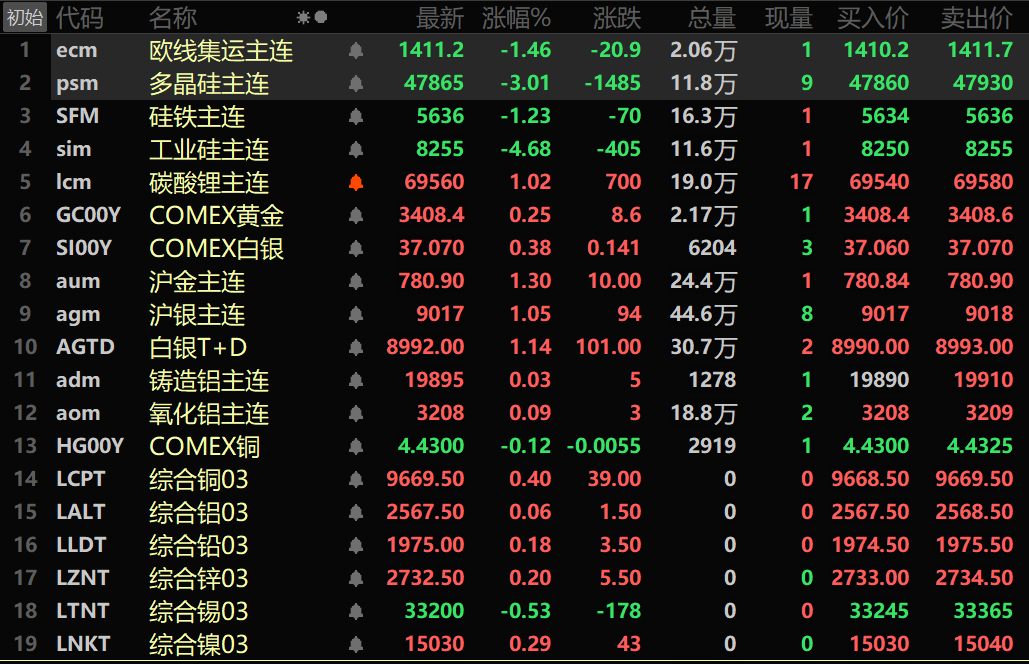 此外,铸造铝主连期货和氧化铝主连均微涨。碳酸锂主连涨1.02%,工业硅主连跌4.68%。多晶硅主连跌3.01%。