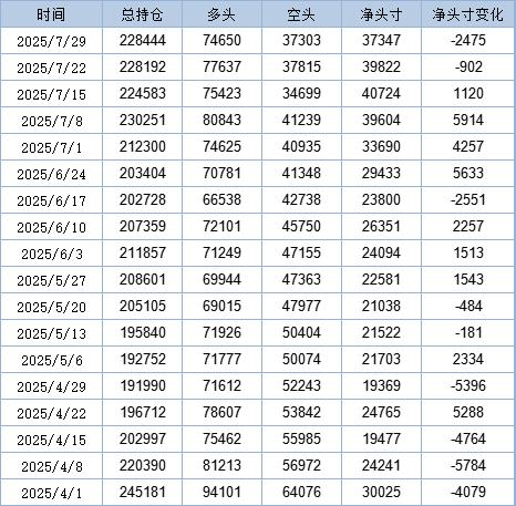 此前临近8月1日重要关税节点,市场情绪谨慎,基金多空力量都有下滑。7月29日当周,基金多头仓位回落至74650手,空头仓位同样回落至37303手,总持仓略有回升至228444手。伴随着美国对进口铜关税征收范围不及预期,COMEX铜出现大幅坠落一幕,或继续打压多头信心。
