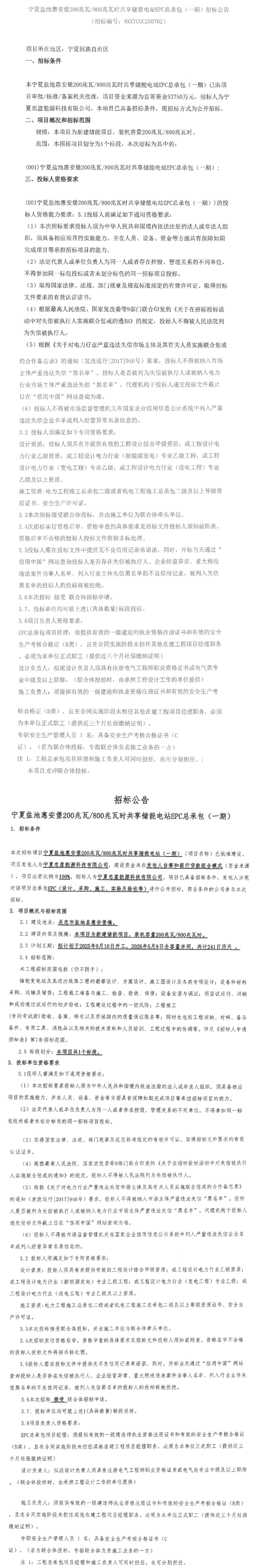 8月3日,宁夏忠盈能源科技有限公司发布宁夏盐池惠安堡200兆瓦/800兆瓦时共享储能电站EPC总承包(一期)招标公告,项目资金来源为自筹资金53750万元,折合单价0.672元/Wh。