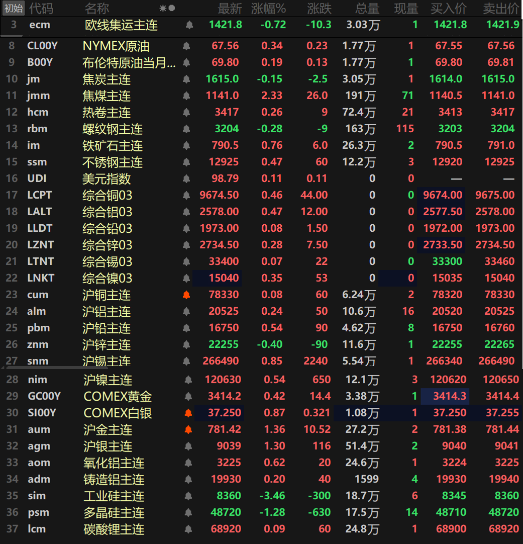 黑色系方面多飘红,铁矿涨0.76%,不锈钢涨0.47%。螺纹跌0.28%,双焦方面,焦煤涨2.33%,焦炭跌0.15%。