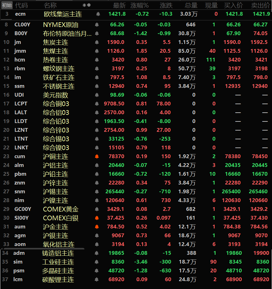黑色系方面集体飘红,铁矿涨1.08%,热卷涨0.8%。双焦方面,焦煤涨1.85%,焦炭涨0.35%。