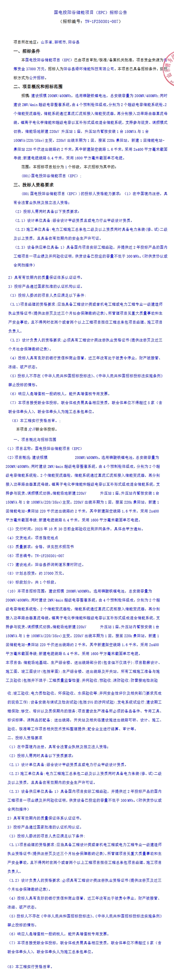 8月1日,阳谷县绿环储能科技有限公司发布国电投阳谷储能项目(EPC)招标公告,项目位于山东省聊城市阳谷县,项目建设规模200MW/400MWh,选用磷酸铁锂电池,总安装容量为200MW/400MWh;同时建设 2Mw/4min超级电容整套系统,由4个预制舱体组成,分别为2个超级电容储能系统舱、2个储能变流器舱,储能系统通过直流汇流柜接入储能变流器,再分别接入功率路由器直流母线。锂离子电化学储能和超级电容以互补形式组成混合储能系统,支持参与现货、调频模式切换。