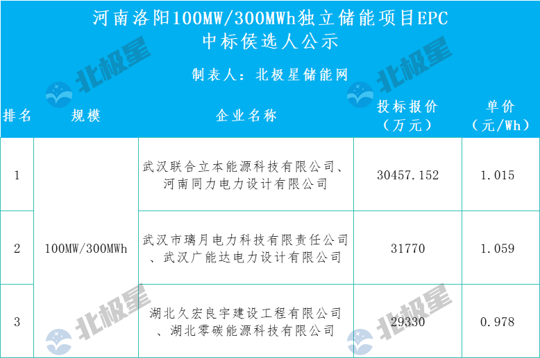 第一中标候选人为武汉联合立本能源科技有限公司、河南同力电力设计有限公司联合体,投标报价30457.152万元(勘察设计费报价:3200000.00元;建设工程费报价:301371520.00元),折合单价1.015元/Wh;