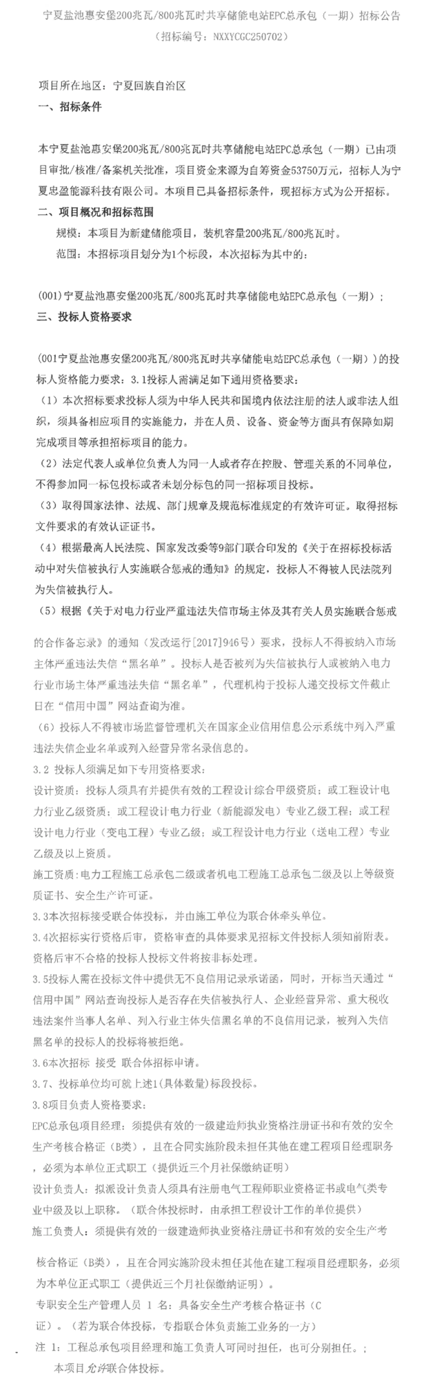 北极星储能网讯:8月3日,宁夏盐池惠安堡200兆瓦/800兆瓦时共享储能电站EPC总承包(一期)招标公告发布,项目资金来源为自筹资金53750万元,招标人为宁夏忠盈能源科技有限公司。