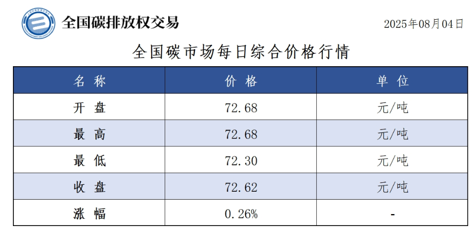 今日全国碳市场综合价格行情为: 开盘价72.68元/吨,最高价72.68元/吨,最低价72.30元/吨,收盘价72.62元/吨,收盘价较前一日上涨0.26%。