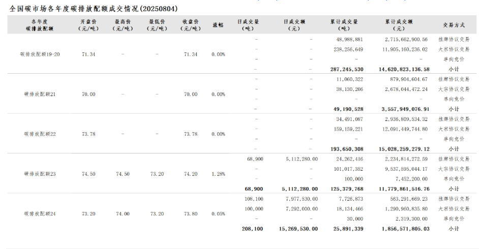 2025年1月1日至8月4日,全国碳市场碳排放配额成交量51,088,809吨,成交额3,810,737,710.89元。