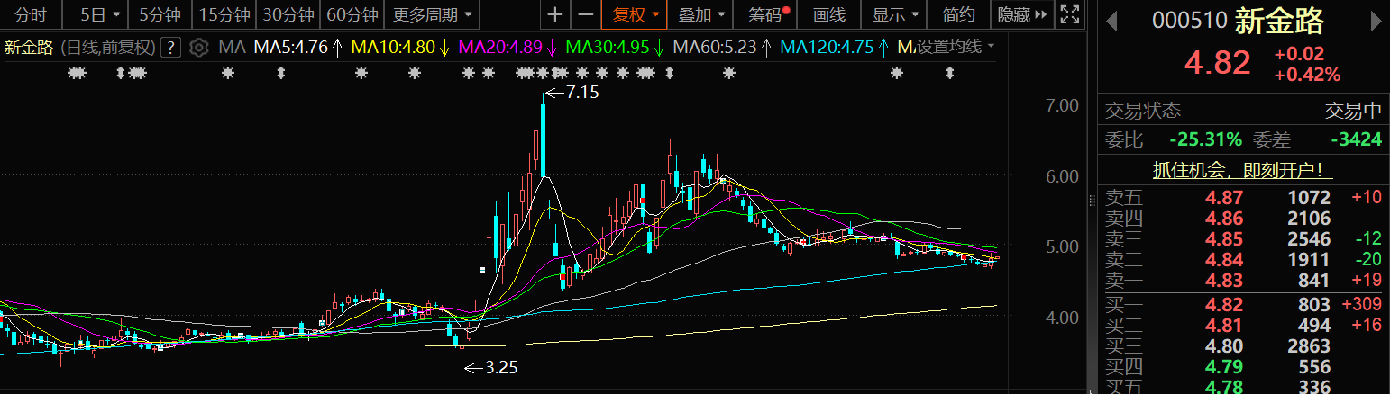 8月5日,新金路的股价早盘小幅上涨,截至5日9:35分,新金路涨0.42%,报4.82元/股。