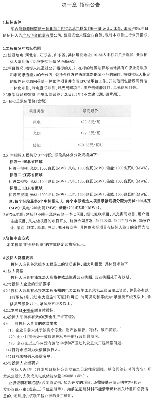 华合能源源网荷储一体化项目EPC总承包框架(第一期:河北、江苏、山东)招标公告