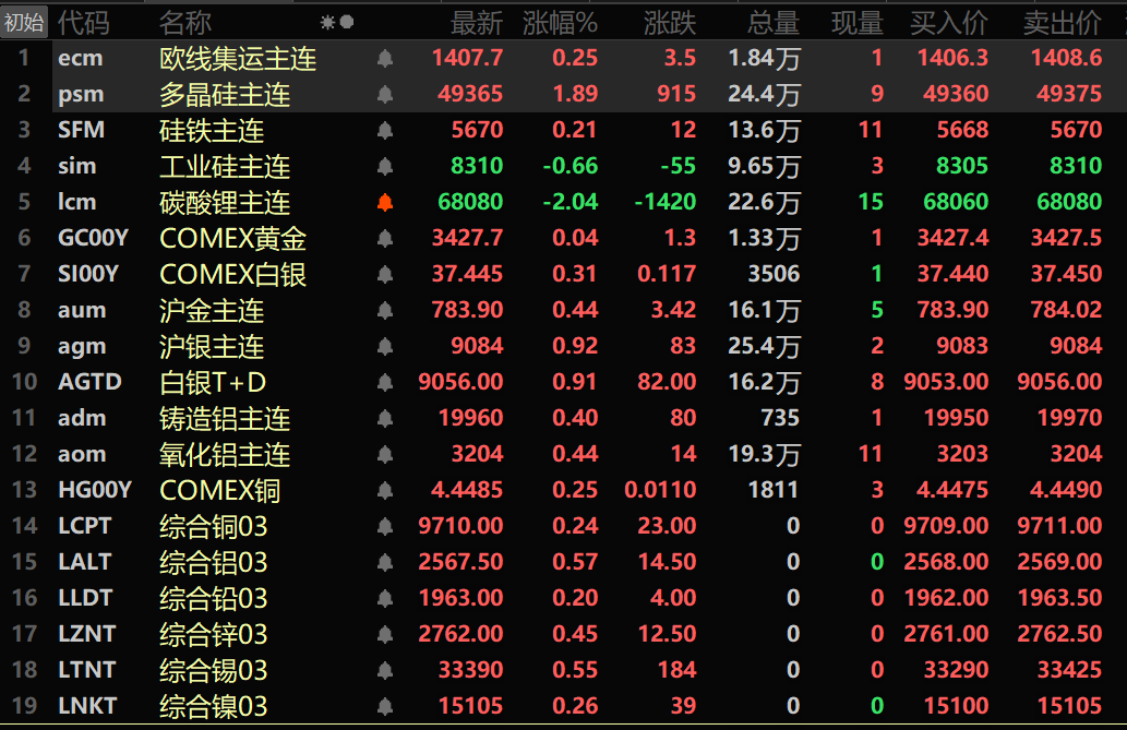此外,铸造铝主连期货和氧化铝主连分别涨0.4%、0.44%。碳酸锂主连跌2.04%,工业硅主连跌0.66%。多晶硅主连涨1.89%。