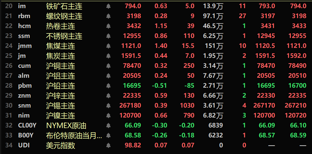 黑色系均飘红,铁矿涨0.63%,螺纹涨0.28%,热卷涨1.15%。不锈钢涨0.86%。双焦方面:焦煤主力合约涨1.4%,焦炭主力合约涨0.44%。