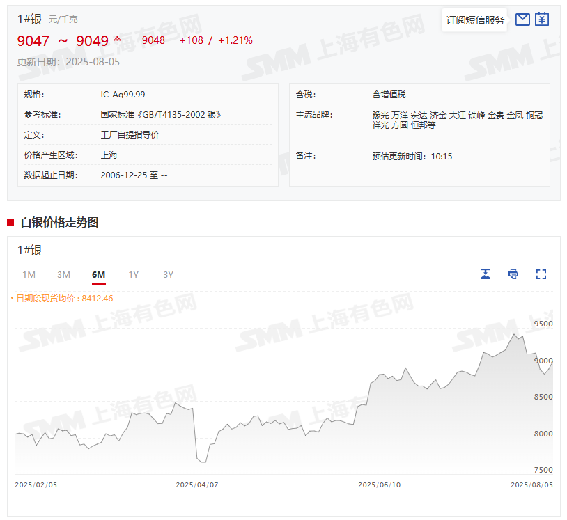 8月5日,银价延续偏强震荡,日内沪期银2510合约-TD基差扩大至30-33元/千克,现货市场上成交增量。据SMM了解,5日上海地区现款现货的国标银锭仓单TD升水上调至5-6元/千克报价成交,尽管对沪期银2510合约报价的持货商贴水仍维持22-23元/千克并成交寡淡,但这些持货商普遍惜售,对沪期银2510合约贴水并未出现明显扩大。华南市场冶炼厂对沪期银2510合约贴水25元/千克报价出厂,下游仅少量刚需采购,成交偏淡。日内因基差原因,持货商报价差异较大,下游终端客户维持刚需采购,畏跌情绪缓和后,现货市场交投氛围逐渐转暖。
