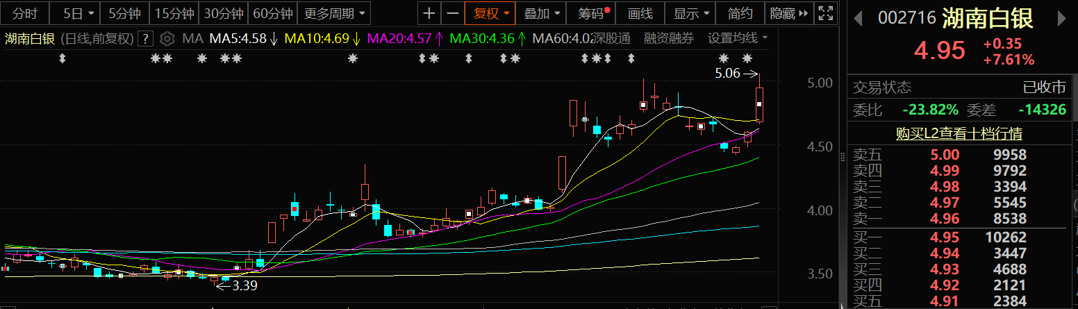 湖南白银股价8月5日延续前两个交易日的涨势继续上涨,截至8月5日收盘,湖南白银涨7.61%,报4.95元/股。