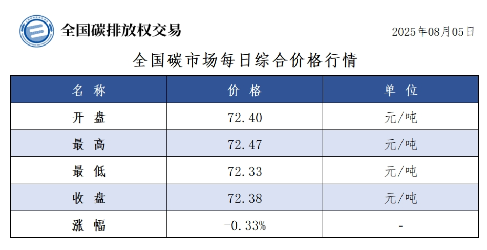 今日全国碳市场综合价格行情为: 开盘价72.40元/吨,最高价72.47元/吨,最低价72.33元/吨,收盘价72.38元/吨,收盘价较前一日下跌0.33%。