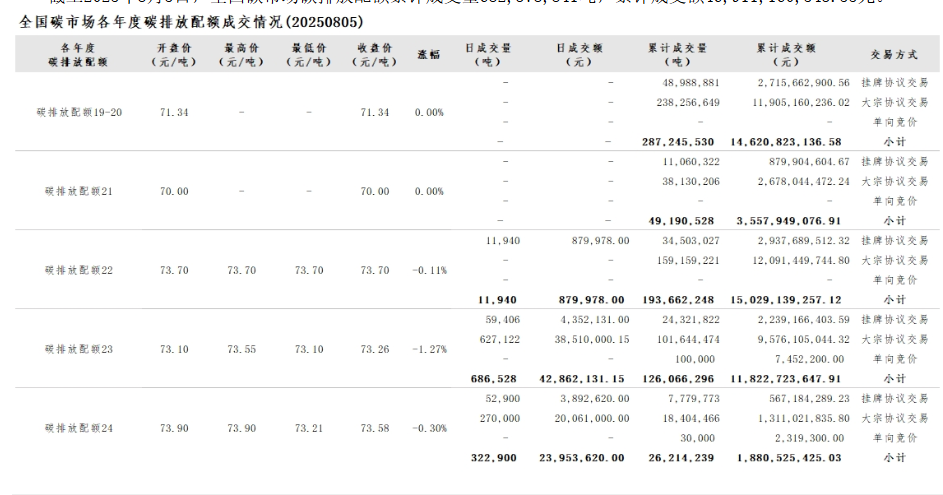 2025年1月1日至8月5日,全国碳市场碳排放配额成交量52,110,177吨,成交额3,878,433,440.04元。