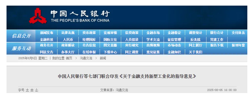 中国人民银行等七部门联合印发《关于金融支持新型工业化的指导意见》