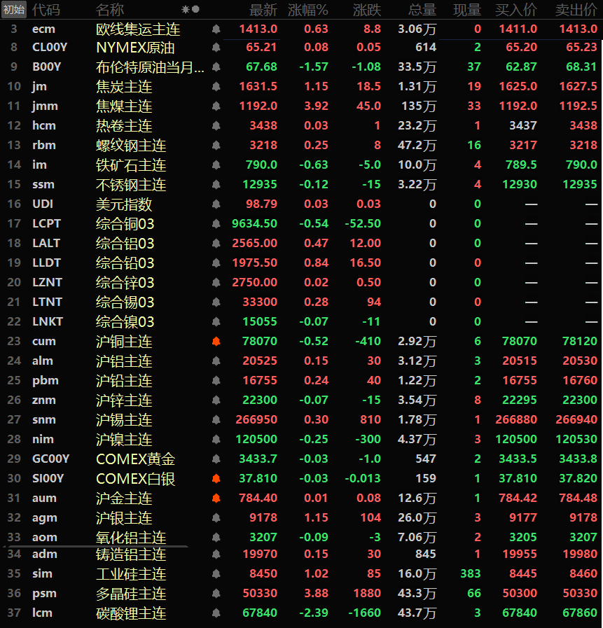 黑色系方面涨跌互现,铁矿跌0.63%,不锈钢跌0.12%。双焦方面,焦煤涨3.92%,焦炭涨1.15%。