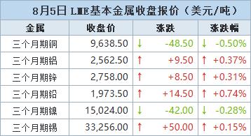 伦敦时间8月5日17:00(北京时间8月6日00:00),LME三个月期铜下跌48.5美元,或0.5%,收报每吨9,638.50美元,盘初触及每吨9,747.50美元的高位。