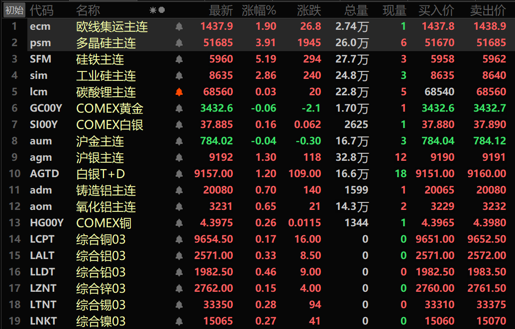 此外,铸造铝主连期货和氧化铝主连分别涨0.7%、0.65%。碳酸锂主连微涨0.03%,工业硅主连涨2.86%。多晶硅主连涨3.91%。