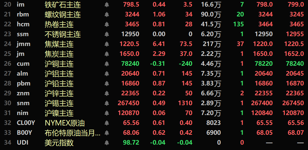 黑色系多飘红,铁矿涨0.44%,螺纹涨1.06%,热卷涨0.81%。不锈钢平于12950元/吨。双焦方面:焦煤主力合约涨6.41%,焦炭主力合约涨2.29%。