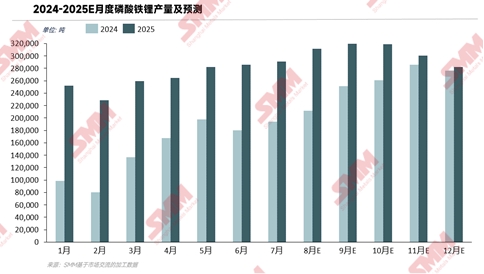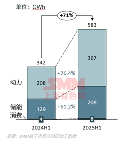 从需求端来看,2025年上半年,磷酸铁锂总需求量仍然稳固上升,根据SMM调研数据显示,2025年上半年中国磷酸铁锂动力电芯总产量约为367GWh,同比去年增加76%;储能电芯总产量约为208GWh,同比去年增加61%;消费电芯总产量约为7.76GWh,同比增加约88%;总产量合计约为583GWh,同比去年增加70.6%。总需求约为140万吨磷酸铁锂正极材料,比去年增加了约55万吨。