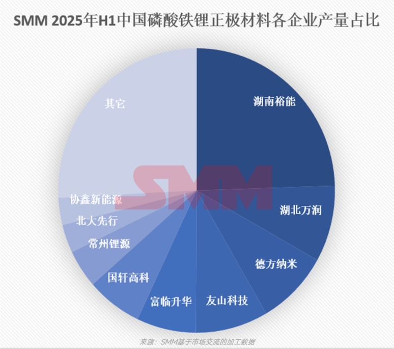 从供应端来看,2025年上半年中国磷酸铁锂总产量约为157万吨,同比去年增长82.3%。除2月有小幅减量外,其余每月产量均有小幅增长,6月达到2025年H1单月产量最高 - 约为28.5万吨。然而行业CR10有所下滑 - 由2024年上半年的 81%下滑至今年上半年的75%,这主要是由于在2024年下半年开始,一些中小型材料厂凭借相对较低的价格优势分得部分头部订单,逐步为自己在市场中争得一席之地,产量逐步增加。当然也会存在有部分小型材料厂订单需求维持较弱水平,生存困难,随时可能面临产能出清的风险。
